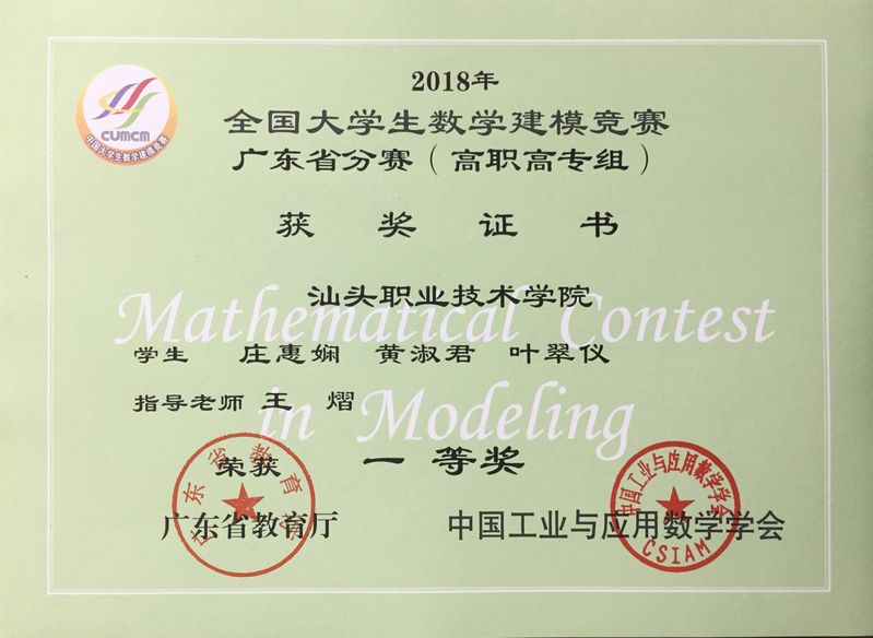 参加全国大学生数学建模竞赛广东省分赛荣获一等奖