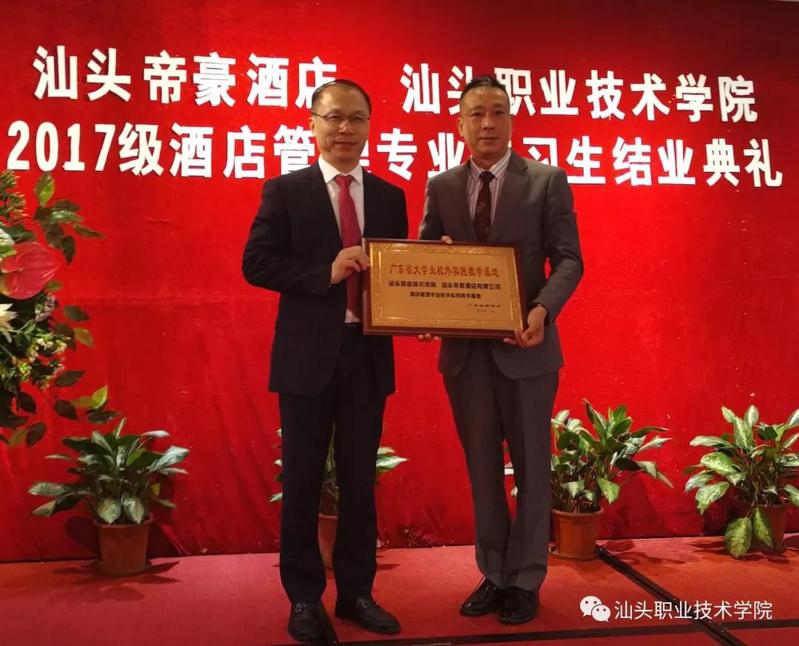 汕头帝豪酒店有限公司是bwin必赢唯一官方网站酒店管理专业与酒店行业紧密联系的纽带,是校企合作办学、产教深度融合的重要平台,是酒店管理专业实施人才培养模式改革、提高人才培养质量的重要保障。此次汕头帝豪酒店获得广东省大学生校外实践教学基地授牌,是对实践教学的充分肯定。