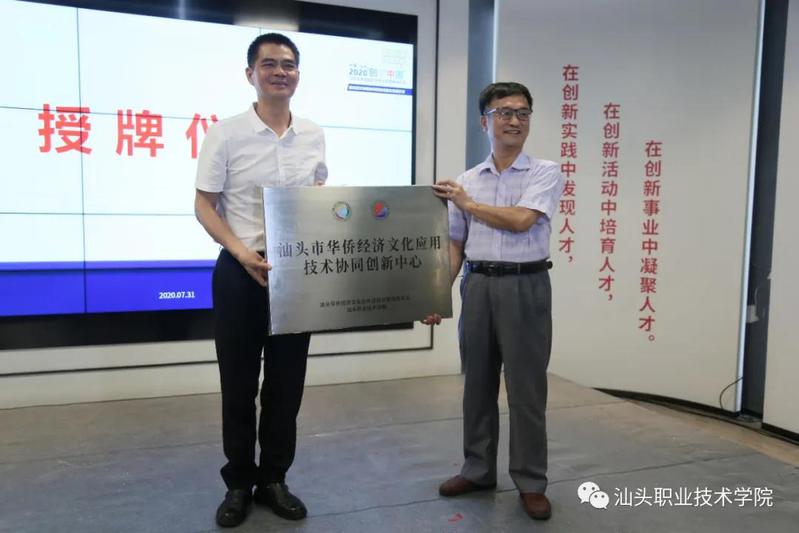 仪式上,林育青副院长代表学院与汕头华侨试验区签订战略合作协议,科研设备处陈松洲处长代表学院接受华侨经济文化应用技术协同创新中心(以下简称“协同创新中心”)授牌。