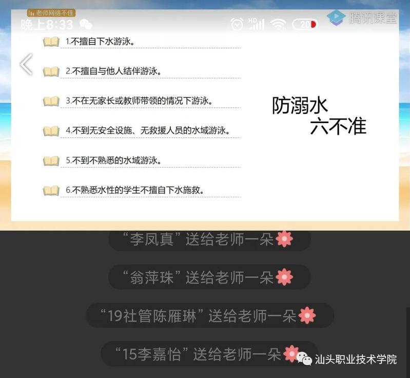 本次主题班会,马若彤老师分别从加强防火、防盗、防抢、防骗、防交通事故、防溺水以及人身安全防范等方面进行安全教育,贯彻“安全第一,预防为主”的方针。同时,叮嘱同学们注意新冠肺炎疫情的防控,教育学生暑假期间尽可能避免跨市、跨省乃至海外出行,如确有必要外出,则避免到高、中风险地区出行,出行途中做好个人疫情防护,提前报备至辅导员,同时坚持做好每日“粵康码”健康上报工作。各位同学签署学系安全教育倡议书,时刻提醒自己注意人身安全。