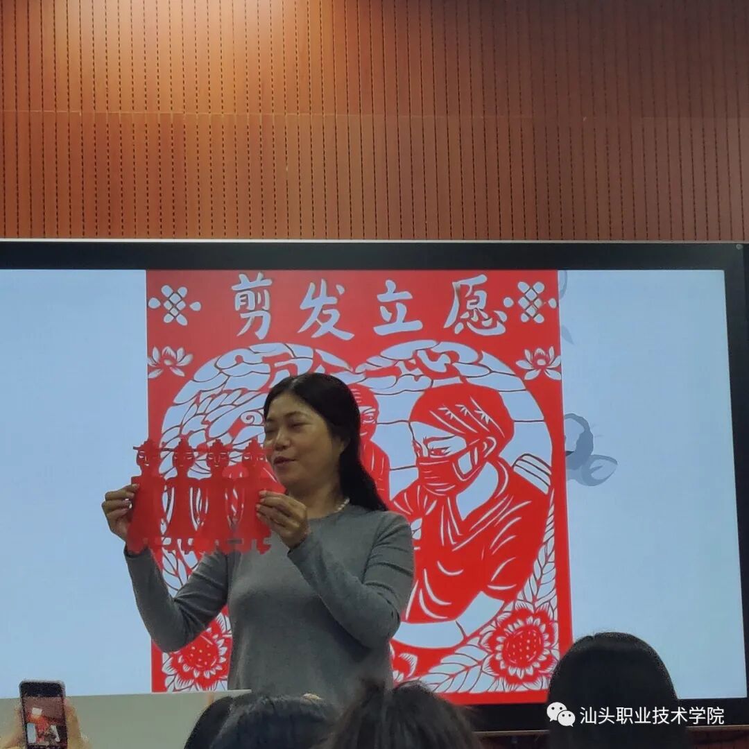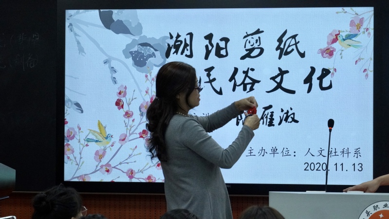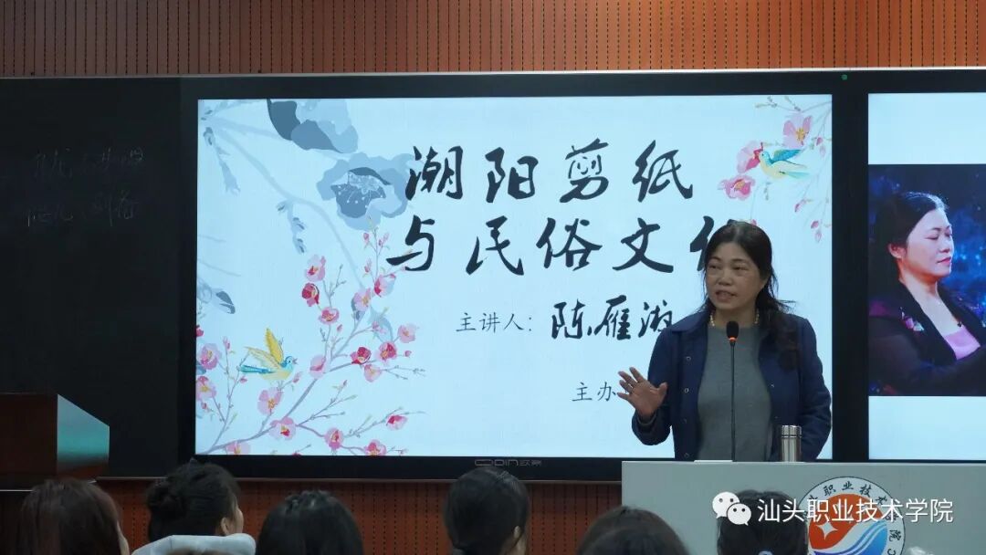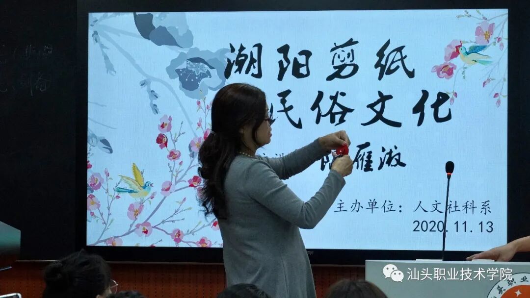 11月13日上午,人文社科系邀请国家级非物质文化遗产项目(剪纸)省级代表性传承人陈雁淑老师在金园录播室为全系师生开了一场别开生面的讲座:《潮阳剪纸与民俗文化》。人文社科系承担了学院“创新强校”(2019-2021)二级项目《潮汕文化传承与发展研究》,陈雁淑老师是该项目的子项目“陈雁淑技能大师工作室”首席技能大师,汕头市优秀拔尖人才,四十年耕耘,精品不断。人文社科系副主任杨映红、人文社科系办公室主任郑菲、人文社科系第二党支部书记伍娜等出席讲座。讲座由汉语言文学教研室主任林钗主持。