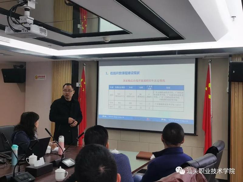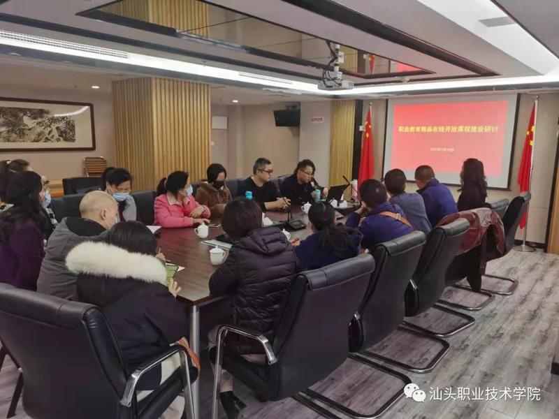 2021年1月19日上午,职业教育精品在线开放课程建设研讨会在汕头市人力资源服务产业园5楼人才驿站会议室召开,本次研讨会由学院教务处和汕头市人力资源产业园服务中心联合举办,汕头市人才驿站(总站)协办。会议由教务处黄健新副处长主持,参会人员包括院级质量工程项目立项建设的精品在线开放课程负责人、教务处相关人员及智慧职教的在线开放课程的专家。