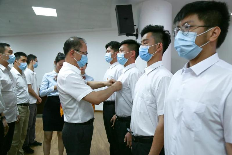 仪式在庄严的国际歌中拉开序幕,周乐新同志宣读了2021年新吸收党员名单,由王小辉同志为为新党员代表佩戴党员徽章。