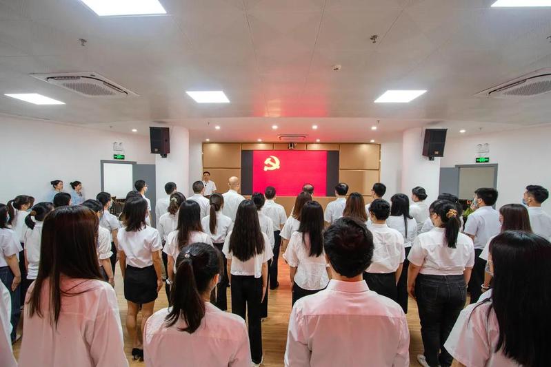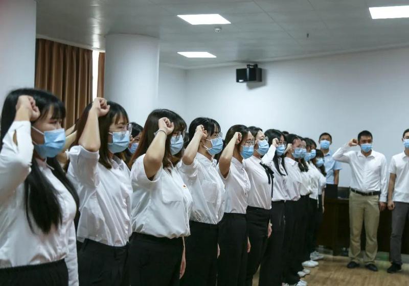 激昂的歌声过后,在黄少明同志的带领下,所有在场新党员面向党旗,举起右手,紧握右拳,庄严宣誓,短短的誓词是新发展党员入党后对党的永恒承诺,也让老党员重温入党初心、牢记党员使命,每个人的脸庞都洋溢着神圣、庄严的荣光。