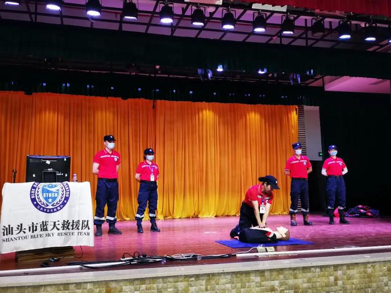 夏季到来后,各地发生了多起学生溺水事件,针对近期学生的溺水事故,做好防患于未然,汕头市蓝天救援队主讲袁老师亲自为学生科普溺水后的自救及互救知识,分别从如何正确的使用游泳器材、游泳前热身运动、游泳中的自救和互救的注意事项几个方面给学生们做详细讲解,并邀请学生上台进行实操演练,让学生有深刻的体会。同时,袁老师还为同学们现场演示如何进行心肺复苏及海姆立克法,提高了学生的应急救护知识。