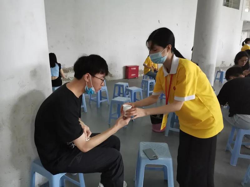 在献血现场,学院志愿者们细心指引献血者们填写表格;引导献血者到体检区进行体检,同时也帮助每位同学测量体温;在休息区,志愿者们为献血者端来一杯暖暖的糖水,为他们贴上创可贴,陪他们聊天,舒缓情绪……