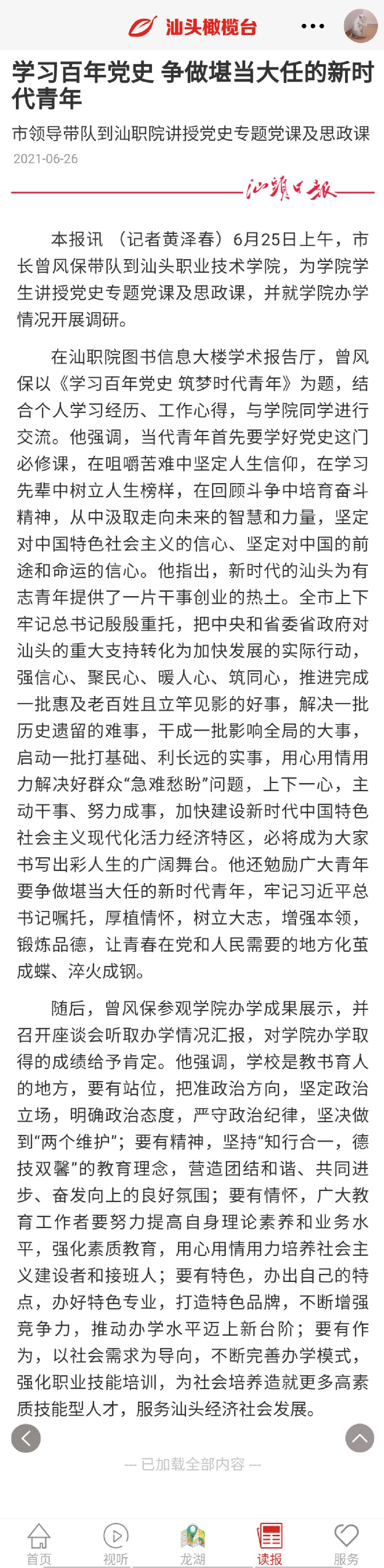 《汕头日报》2021-06-26报道 市领导带队莅院上党史专题党课和思政课