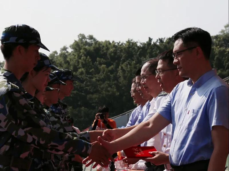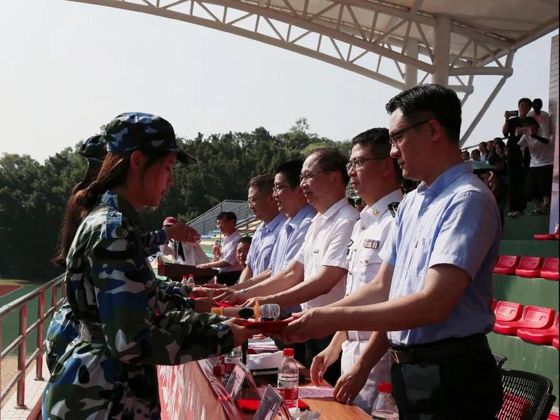 荣誉属于在训练场上拼搏的人。同学们不怕苦、不怕累,强化了国防意识,培养了严明的组织纪律性和团结拼搏、勇于进取的精神。在训练中,涌现出了一批表现突出的集体和个人。本次院本部军训,评出优秀连队5个,军训标兵225个,优秀教官70个。濠江区武装部副部长吴成财海军中校宣读了表彰决定。优秀连队、军训标兵及优秀教官代表上台领奖,骄傲且幸福的笑容洋溢脸上。