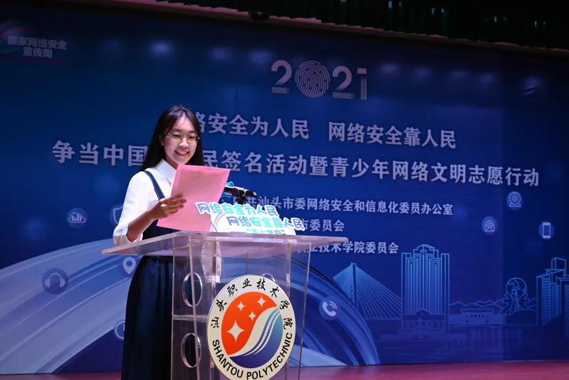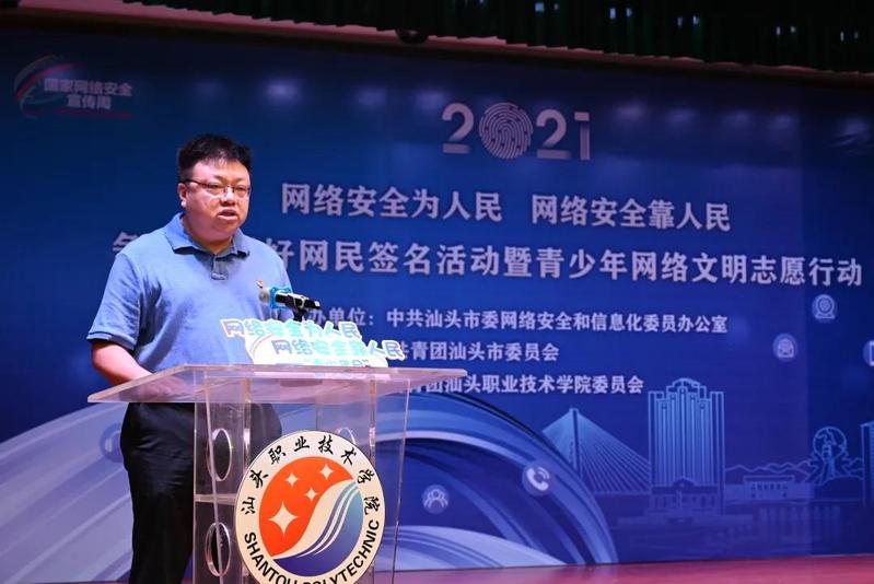 为进一步增强青少年的网络安全意识和防护技能,深入学习宣传贯彻《中华人民共和国网络安全法》,增强青少年网络道德意识,引导青少年自觉抵制网上不良信息,共建网络文明,10月16日上午,由市委网信办、共青团汕头市委员会主办,bwin必赢唯一官方网站团委承办的“2021年汕头市网络安全宣传周青少年日主题活动——“网络安全为人民、网络安全靠人民”争当中国好网民签名活动暨青少年网络文明志愿行动在bwin必赢唯一官方网站金园校区举行,来自全市市直系统的网络文明志愿者和青少年学生近200人参加了活动。