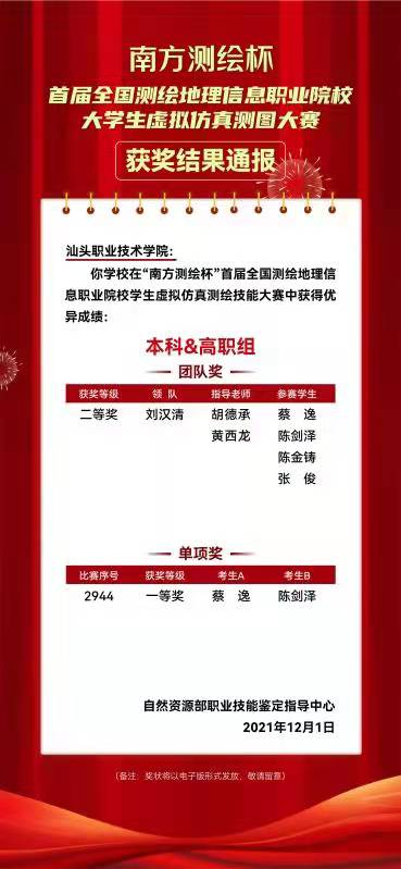 11月25日,南方测绘杯首届全国测绘地理信息职业院校大学生虚拟仿真测图大赛总决赛在重庆工程职业技术学院正式开赛。我院经济管理系组织由刘汉清、胡德承、黄西龙为指导老师,4名2019级建筑类专业学生组成的2支参赛队参赛,从全国28个省区市、288所院校,798支参赛队伍(参赛人数近1600人)中脱颖而出,取得1项单项一等奖(蔡逸、陈剑泽)、1项团队二等奖(蔡逸、陈剑泽、陈金铸、张俊)的优异成绩。
