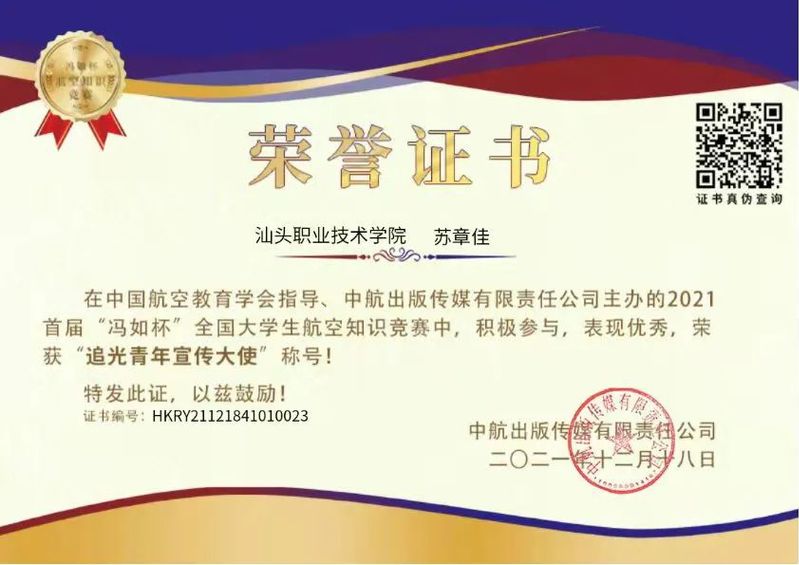 近日,我院计算机系2021级计算机应用技术1班苏章佳同学在由中国航空教育学会指导、中航出版传媒有限责任公司主办的2021首届“冯如杯”全国大学生航空知识竞赛中荣获一等奖,同时被授予“追光青年宣传大使”称号。