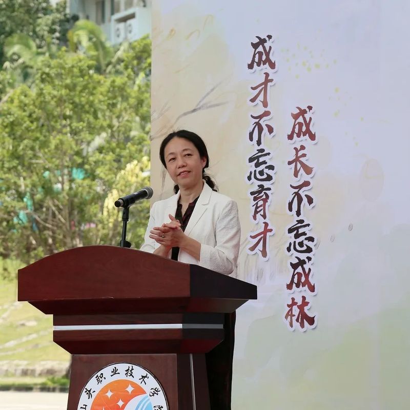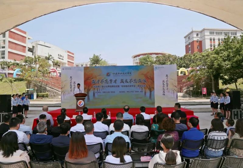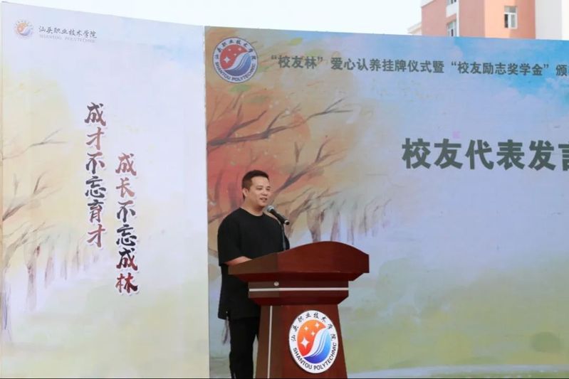 校友代表陈晓加发言,他深情回忆了在母校度过的难忘岁月、同学间的美好情谊及毕业后校友间的互相协助,感谢母校当年的精心培育,他表示汕职人是一个大集体,大家在各行各业持续发光发热,努力积极发挥自身资源优势助力师弟师妹成长,今后将会继续关心关注母校发展,为有志学子助一臂之力。