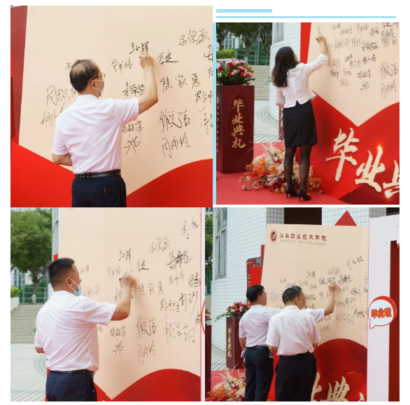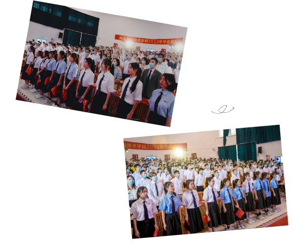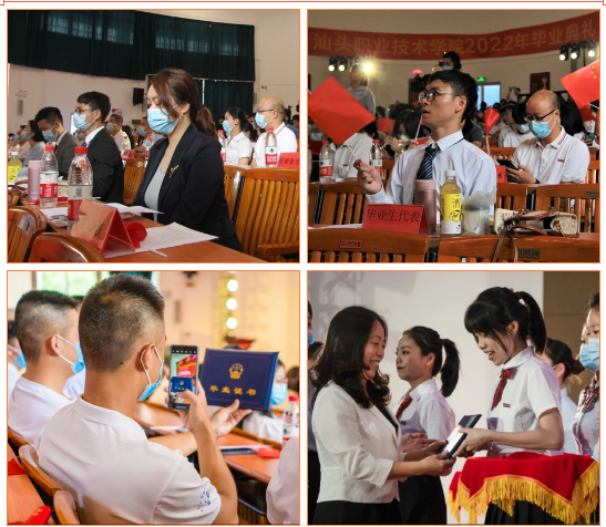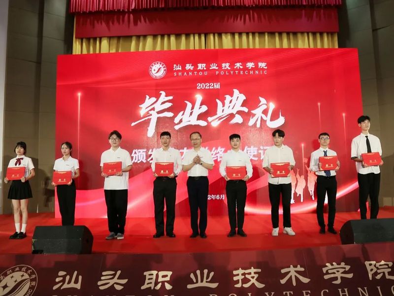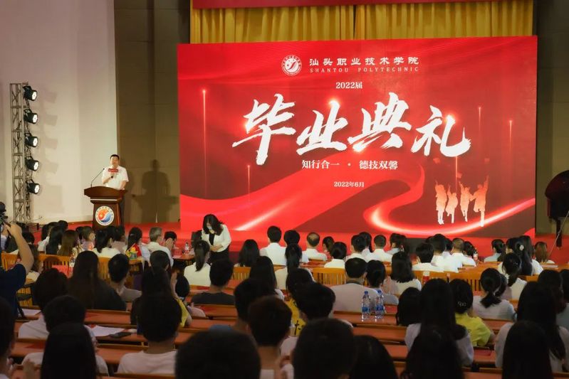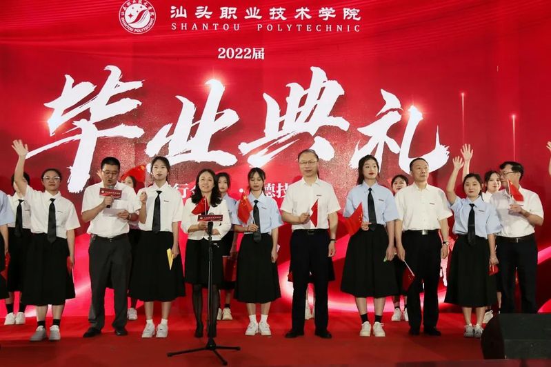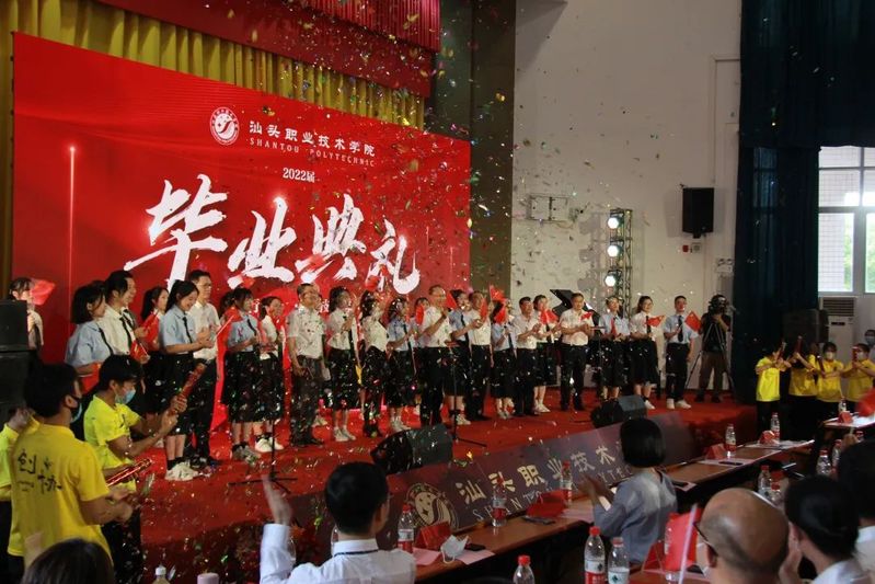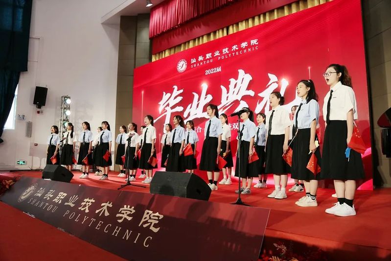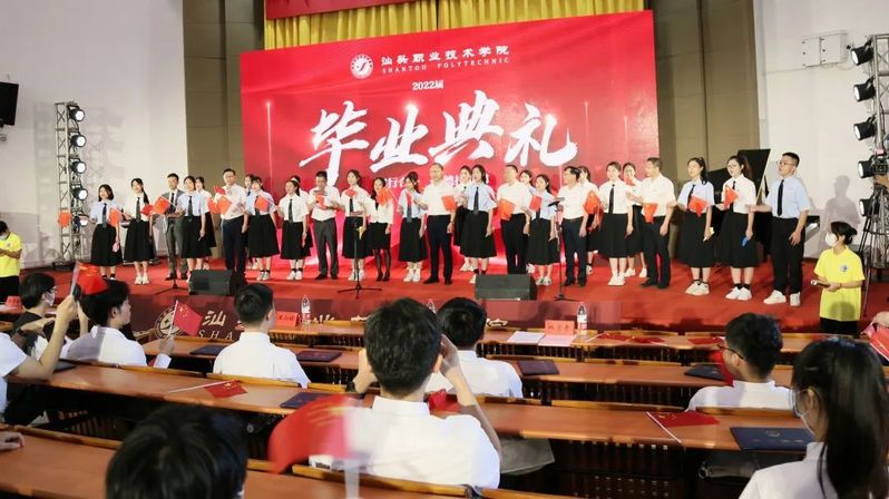 在艺术体育系师生代表领唱下,全场一起挥动国旗,大声合唱《这世界那么多人》《我和你一样》两首歌曲,将现场气氛推向高潮。典礼最后,全场师生同唱校歌《我们从这里起飞》。2022届毕业生正式告别镌刻着他们青春足迹的汕职校园,带着母校的美好祝愿驶向更大、更高、更远的站台,在祖国大地上书写属于“汕职人”的灿烂华章。