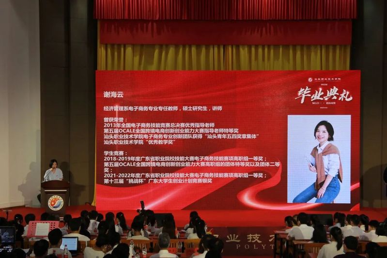 教师代表、经济管理系谢海云老师发言。她向圆满完成学业,开启人生新征程的毕业生致以最诚挚的祝贺。她勉励毕业生要学会主动思考、保有“宽容失败”的心态,主动掌握多项技能,积极进取、勇于创新,成就一番事业,实现人生价值。