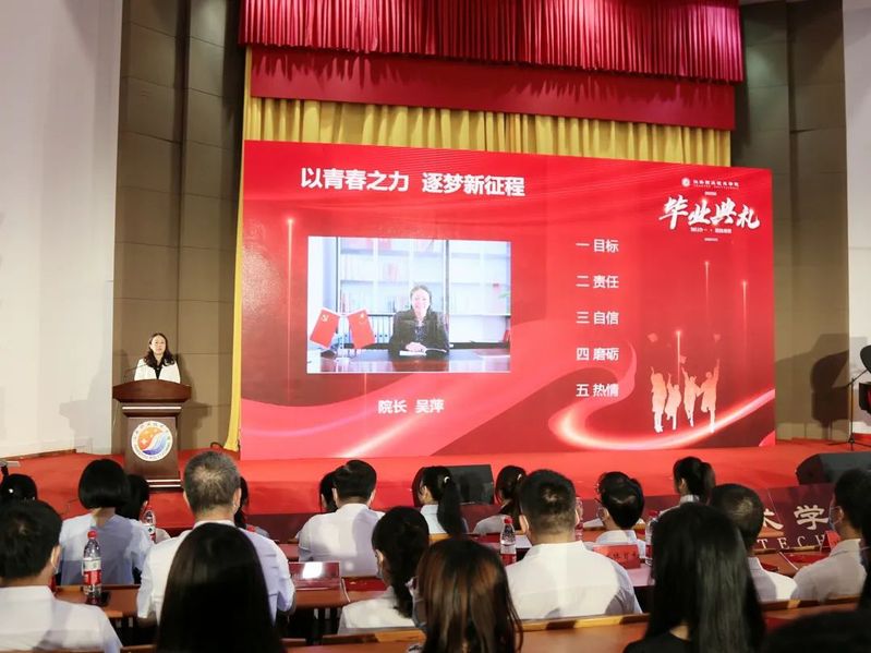 吴萍院长表示,2022届毕业生是不平凡的一届,大家克服了新冠疫情带来的种种困难和不便,见证了祖国一次又一次闪耀在世界舞台中央,也看到了学院办学的长足进步。经过全体教职员工和同学们的共同努力,截至目前,2022届毕业生的就业率达到87.65%,为“史上最难就业年”交了一份较为满意的答卷。最后,吴萍院长对毕业生们提出了“目标”、“责任”、“自信”、“磨砺”、“热情”五点寄望,希望毕业生要把“知行合一、德技双馨”的校训融入到基因里,立长志、行担当、勇于尝试、淡然面对,扬起梦想的风帆,驶向成功的彼岸。