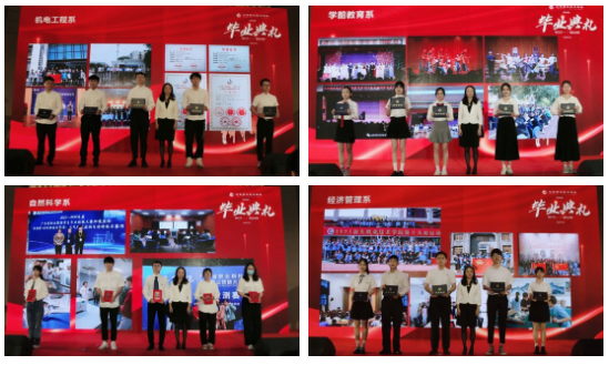 优秀毕业生代表、自然科学系2019级生物教育学生洪楷润作毕业发言。他表示,大学三年他一直自律、谦逊、努力,用“做拥有智慧并富有激情的人,做胸怀大志并脚踏实地的人,做负有责任并勇于担当的人”自勉、奋进。