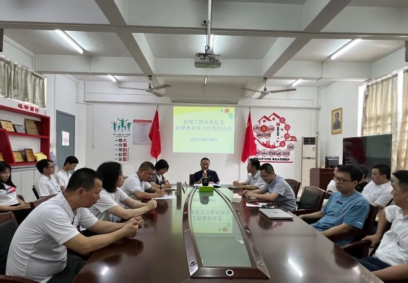 8月29日上午,机电工程系党总支召开党员大会暨2022年纪律教育学习月启动仪式,传达学习学院党委2022年纪律教育学习月活动实施方案精神,部署本系纪律教育学习活动月计划方案。学院党委副书记、纪委书记黄少明莅临我系参加此次活动并对我系相关工作进行指导。