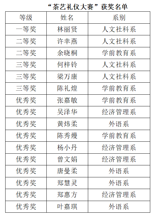 本次大赛的成功举办,促进了参赛师生在茶艺礼仪技能方面切磋,为下一步参加各类比赛积累经验,也向社会各界展示了学院在弘扬中华优秀茶文化,传承潮汕非遗文化方面的成果。