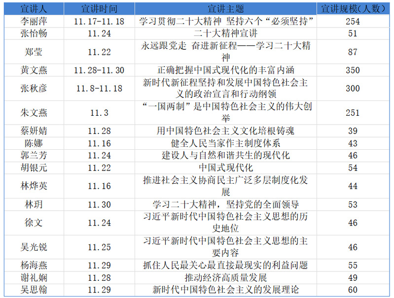 各思政课教师主要围绕党的二十大主题和主要成果、过去五年的工作和新时代十年的伟大变革、马克思主义中国化时代化新境界、以中国式现代化全面推进中华民族伟大复兴、未来五年开局起步关键时期的战略任务和重大举措、全面建设社会主义现代化国家、全面推进中华民族伟大复兴关键在党等方面的内容,对党的二十大精神进行了专题宣讲。