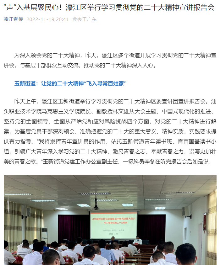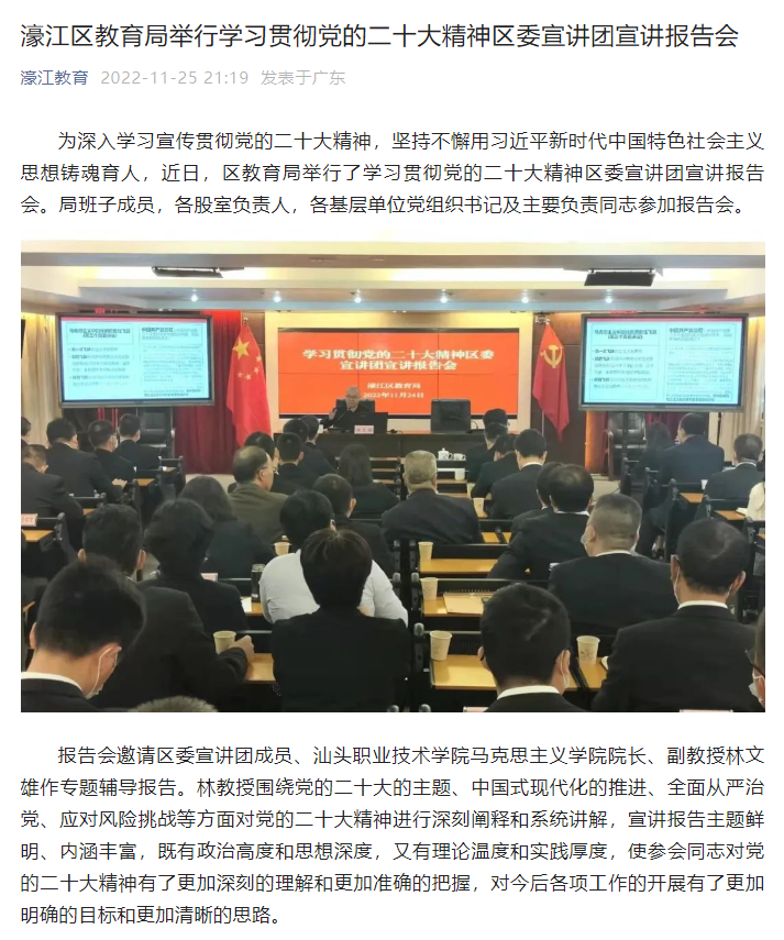 马院林文雄院长、陈辉林副院长作为市委理论宣讲团成员,先后赴濠江区宣传部、濠江区教育局、市档案馆等多个单位开展主题宣讲。两位宣讲团成员以暖心提气的话语、生动鲜活的案例、直观翔实的数据,对党的二十大精神进行了宣讲阐释,并获得好评。
