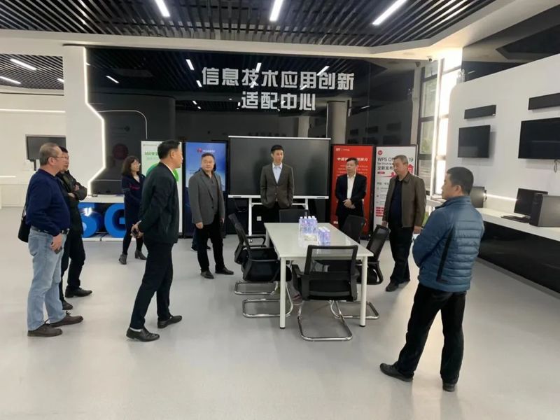 中心领导介绍了该中心的作用和技术生态,从服务器机房到信创产品和技术成果展示区,设备资源丰富,软件系统齐全;从飞腾、鲲鹏、麒麟到各类型软硬件产品,生态信创资源齐全。随后,双方领导就信创人才培养的问题进行深入交流。