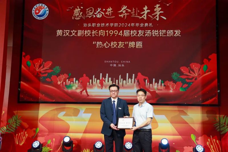 黄汉文副校长向汤锐铓校友颁发“热心校友”牌匾,向校友联络大使林佳琪颁发证书。