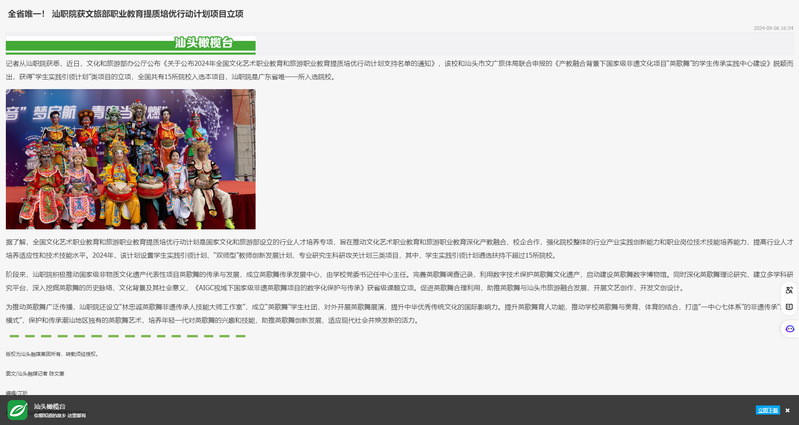 全省唯一! 汕职院获文旅部职业教育提质培优行动计划项目立项