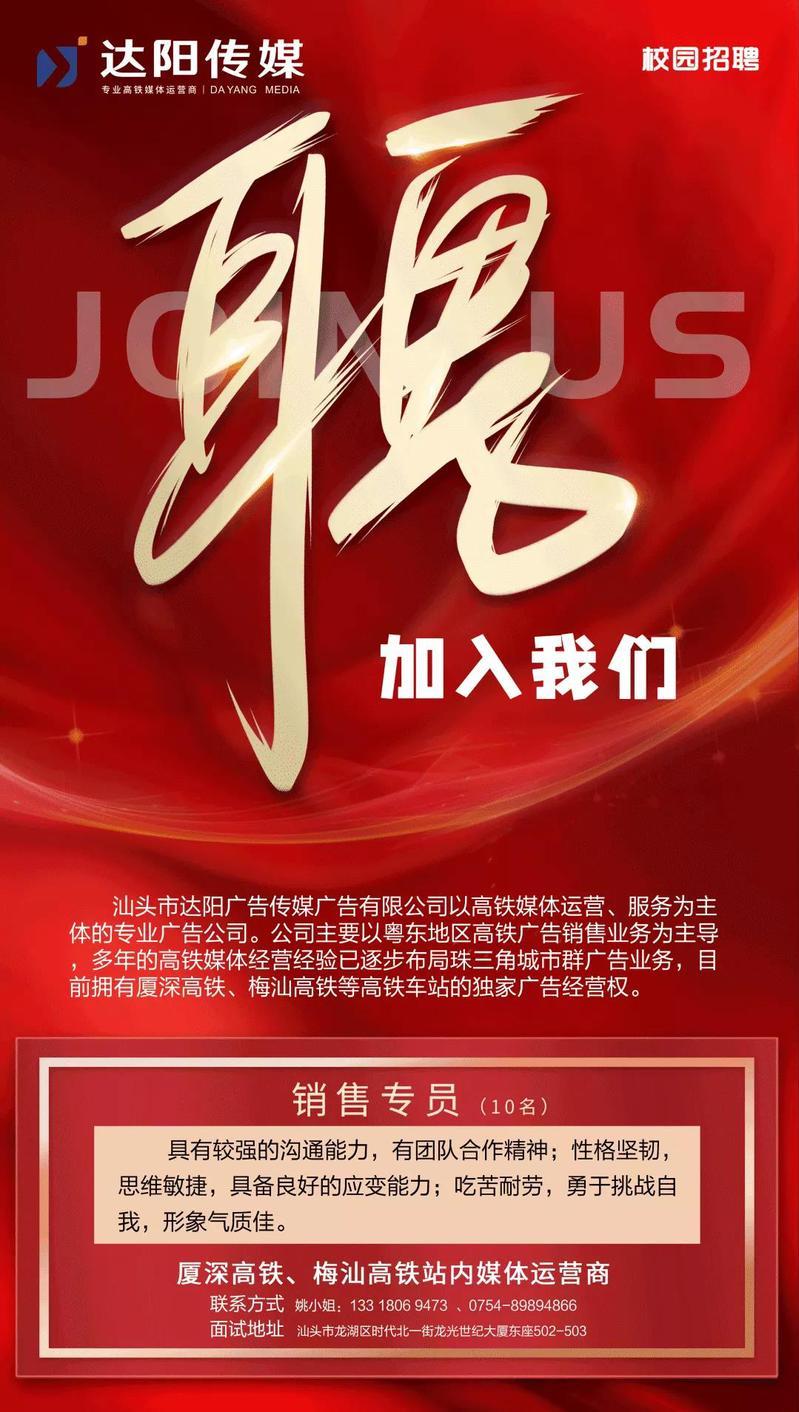 汕头市达阳广告传媒广告有限公司以高铁媒体运营、服务为主体的专业广告公司。公司主要以粤东地区高铁广告销售业务为主导,多年的高铁媒体经营经验已逐步布局珠三角城市群广告业务,目前拥有厦深高铁(潮汕段)等高铁车站的独家广告经营权。